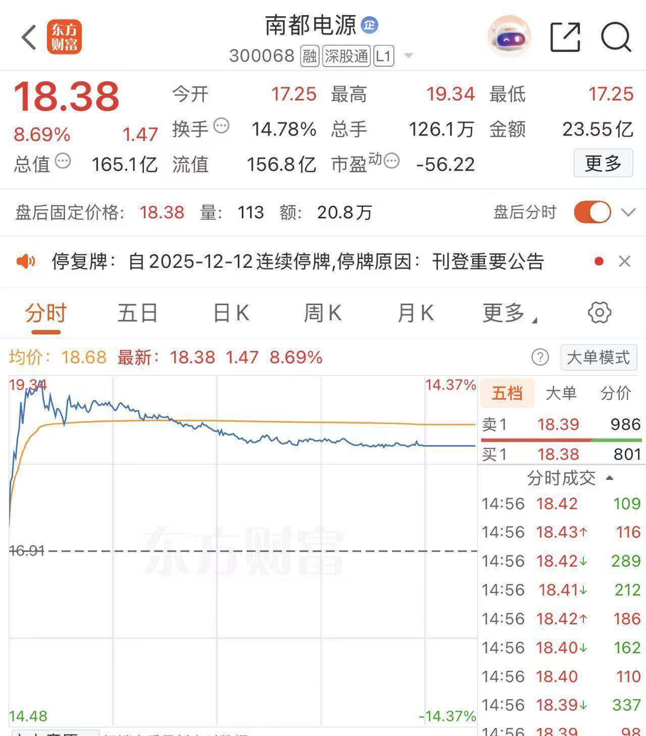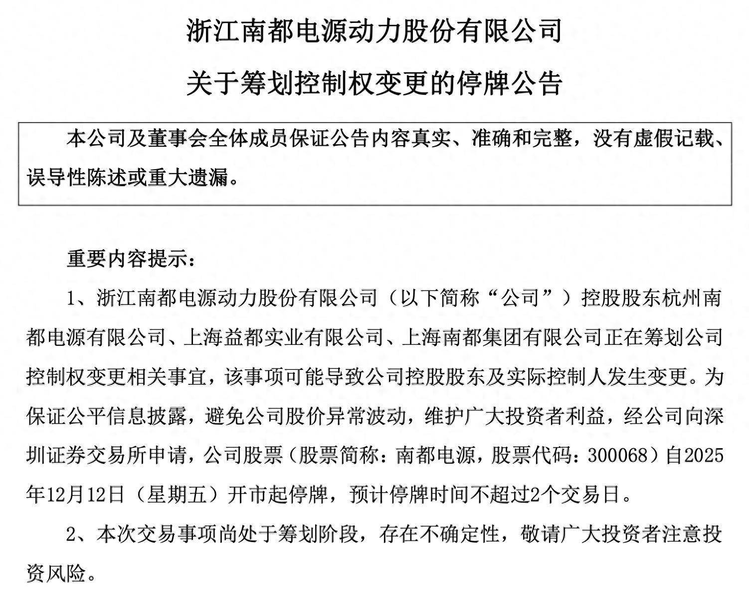 另外,公司股票(股票简称:南都电源,股票代码:300068)自12月12日(星期五)开市起停牌,预计停牌时间不超过2个交易日。