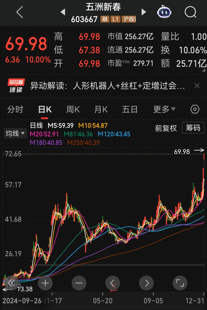 先看五洲新春,这只股年末走出了3天3板的强势行情,2025年最后一个交易日直接封死涨停,收盘价69.98元,涨幅刚好10%。当天交易那叫一个热闹,换手率突破10%,成交36.83万手,成交额高达25.71亿元,足见市场关注度有多高。资金面上更是主力撑腰,主力资金净流入近亿元,虽然游资和散户有点谨慎选择流出,但主力的坚定买入撑起了股价强势。