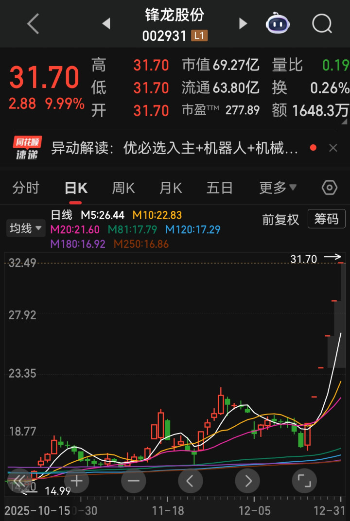 再看锋龙股份,这是年末最炸的一匹黑马,优必选16.65亿元入主拿下43%股权后,直接走出6天6板的逆天行情,12月31日继续涨停收于31.70元,短短几天累计涨幅超60%。人气方面绝对是顶流,复牌后连续无量涨停,市场都在押注这场“AI龙头+传统制造”的联姻,虽然公司澄清一年内不重组、三年不借壳,但资金根本停不下来,市盈率已经冲到277倍,远超行业平均水平。