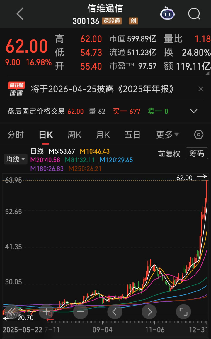 接着是信维通信,虽然没有连续涨停的疯狂,但靠着越疆机器人概念持续拉升,走得稳扎稳打。作为和越疆深度绑定的企业,它赶上了越疆市值突破166亿港元的东风,年末资金关注度稳步提升,属于“慢热型”选手。不过相比前两家,它的盘中波动没那么剧烈,人气和资金炒作热度稍逊一筹,更多是跟着机器人产业链的大行情顺势上涨。