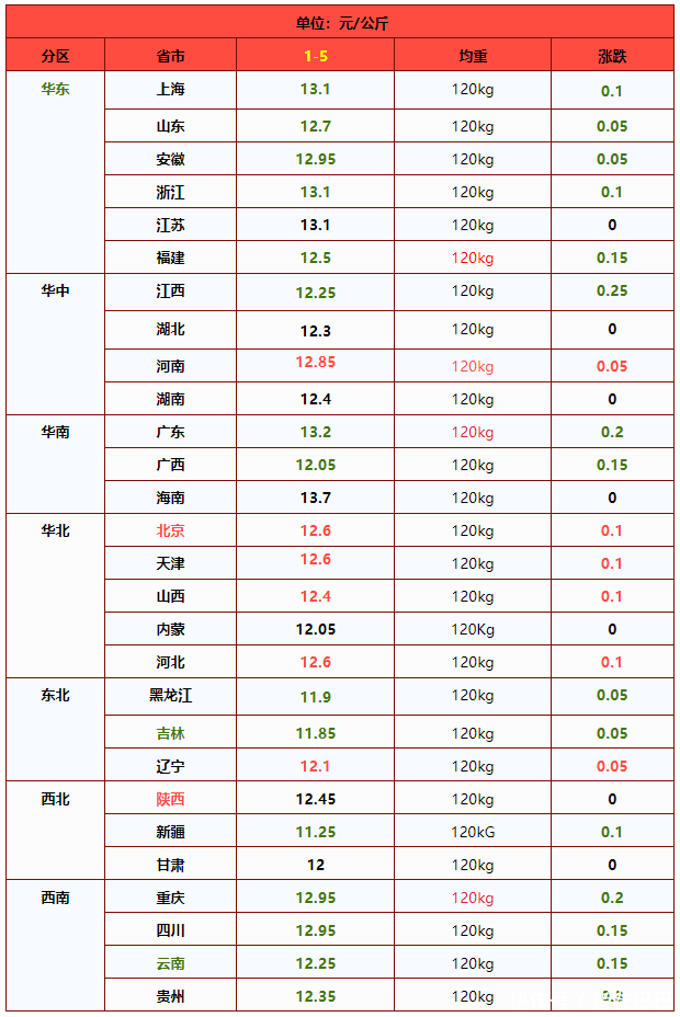 从分区来看,猪价走势略有分歧,北方多地猪价止跌上涨,全国生猪出栏均价与陕西12.45元/公斤相近,其中,黑吉辽报价在11.85~12.1元/公斤,山西以及河北报价12.4~12.6元/公斤,陕甘地区报价在12~14.45元/公斤!而在南方市场,川渝报价12.95元/公斤,江浙地区报价在13.1元/公斤,河南报价12.85元,两广报价在12.05~13.2元/公斤!